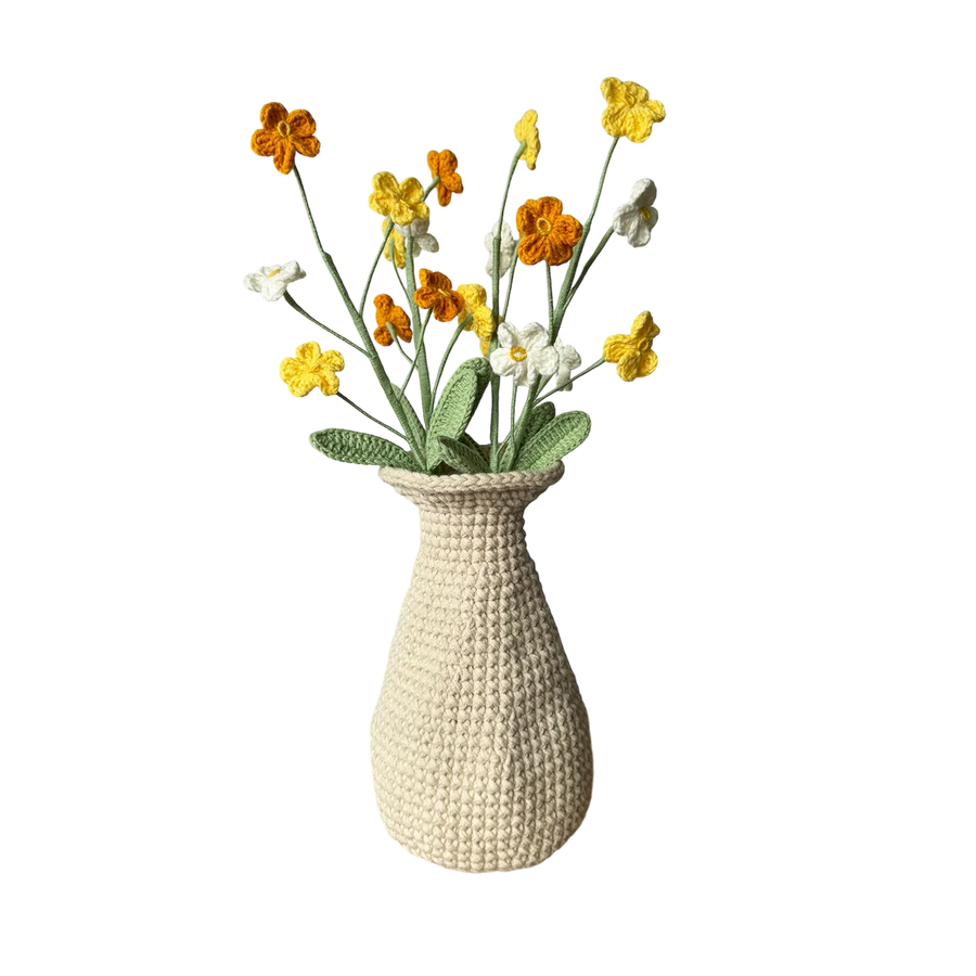 The Autumn Scorpion Bundle comes with a crocheted beige vase and carefully handcrafted flowers, offering a charming touch of nature to any room. Some assembly is required to arrange the flowers in the vase.