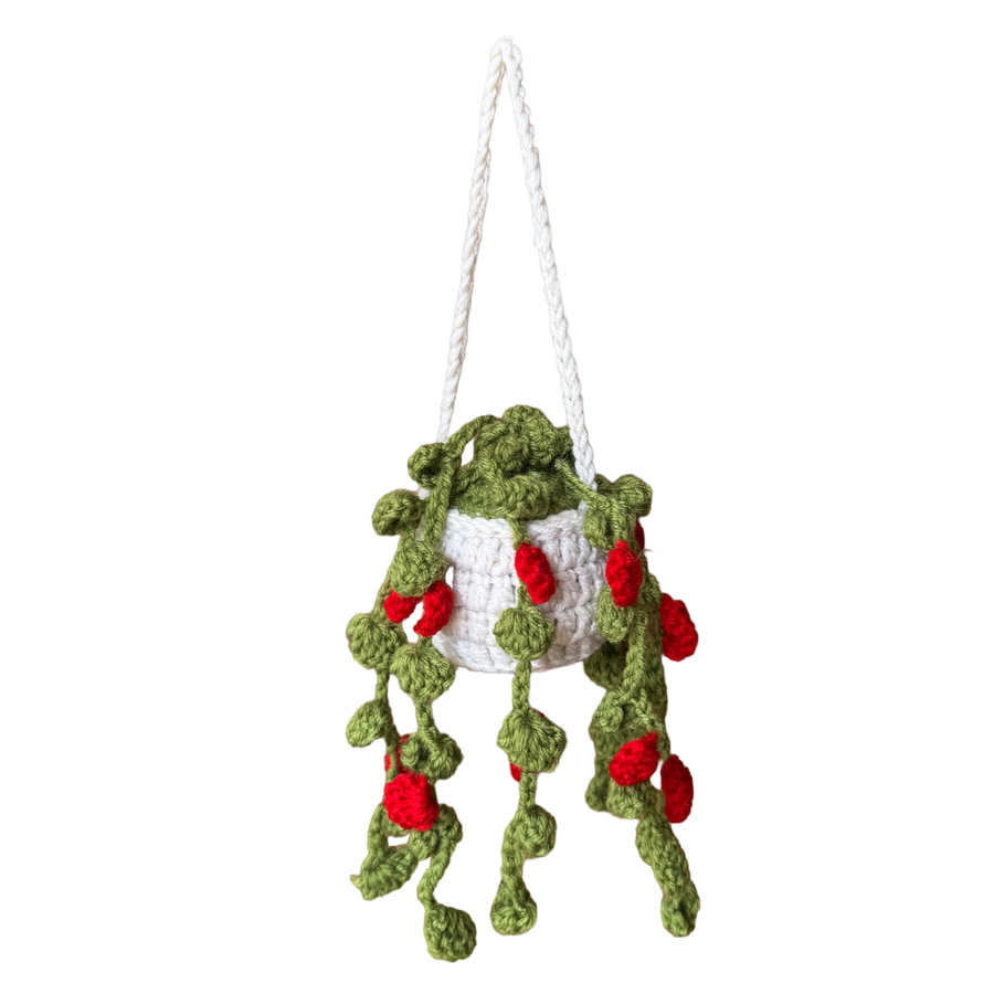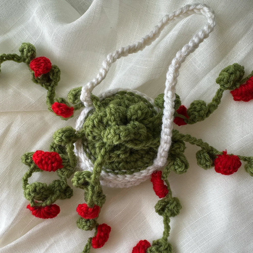 Introducing our Hanging Velvet Vine - This delightful creation features six velvety stems adorned with charming red flowers and mossy green vines, all gracefully suspended in a cozy brown crochet pot.