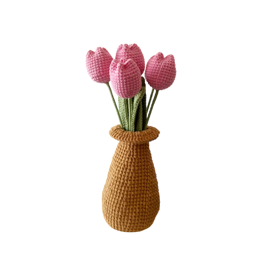 The Pretty in Pink Bundle includes a brown vase and six beautifully crocheted pink round tulips.