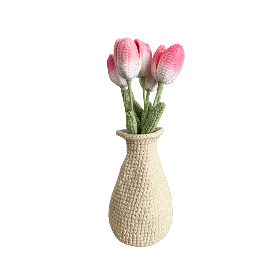 The Two Tone Tulip Bundle includes a beige vase and a carefully curated selection of crocheted tulips. Some assembly is required to arrange the flowers in the vase.